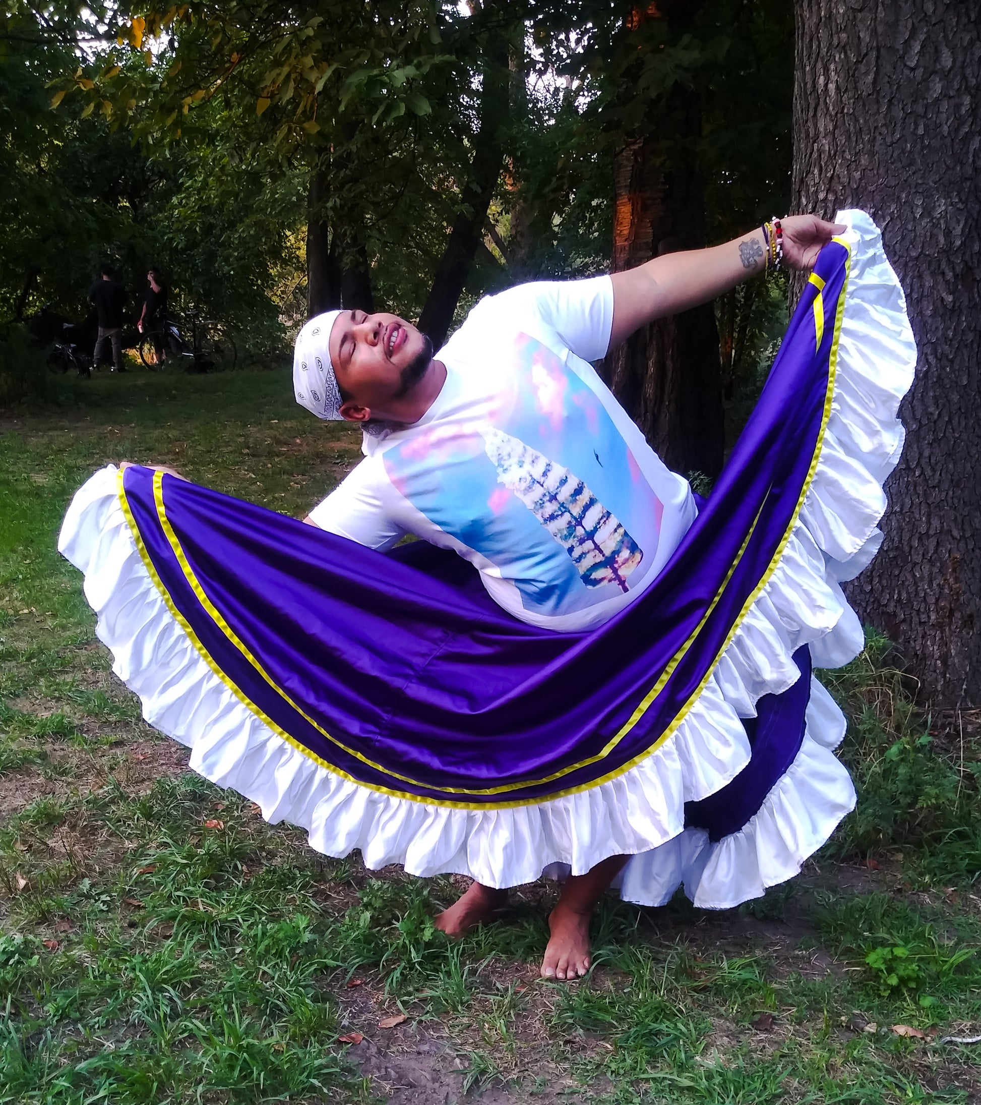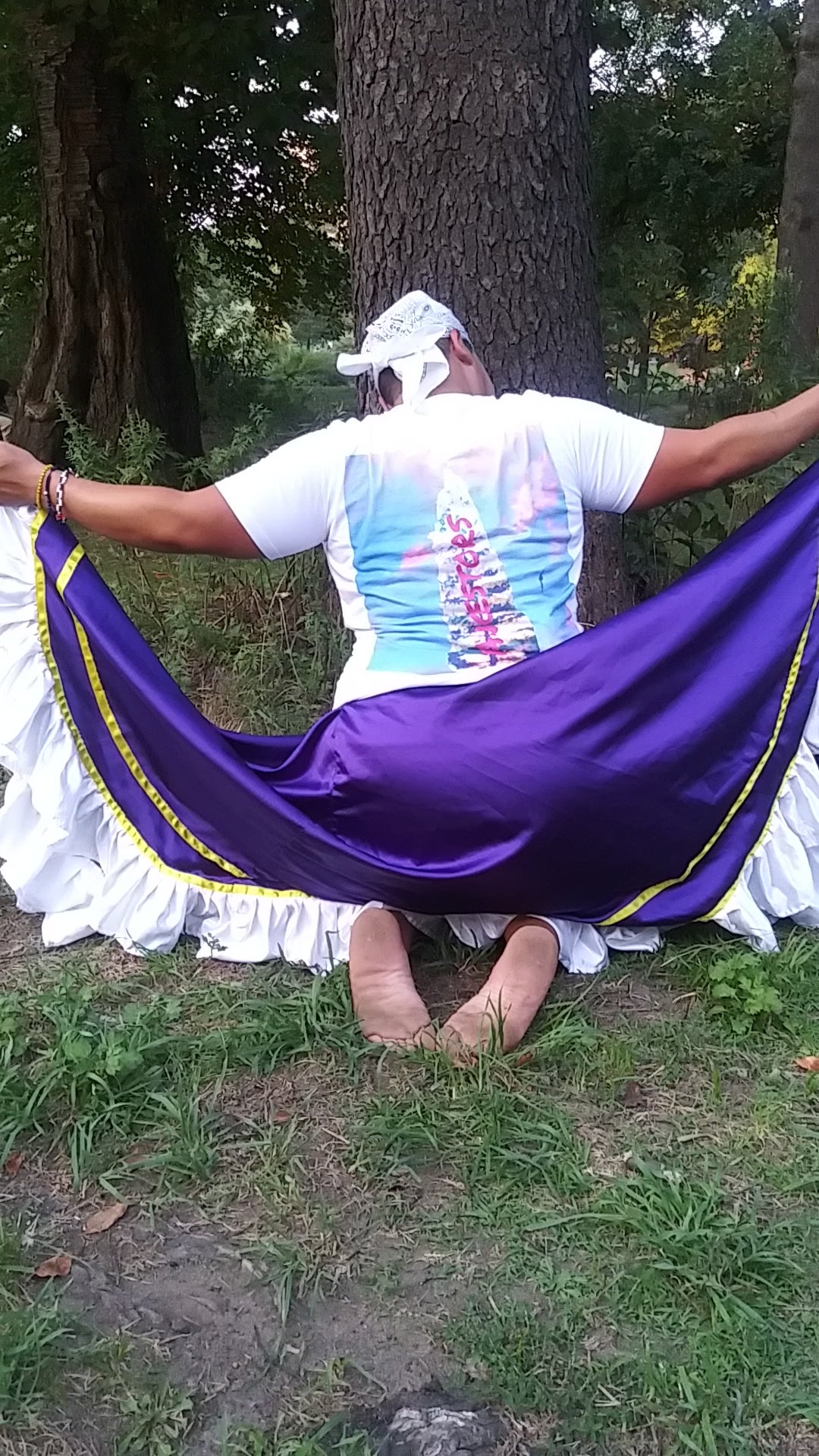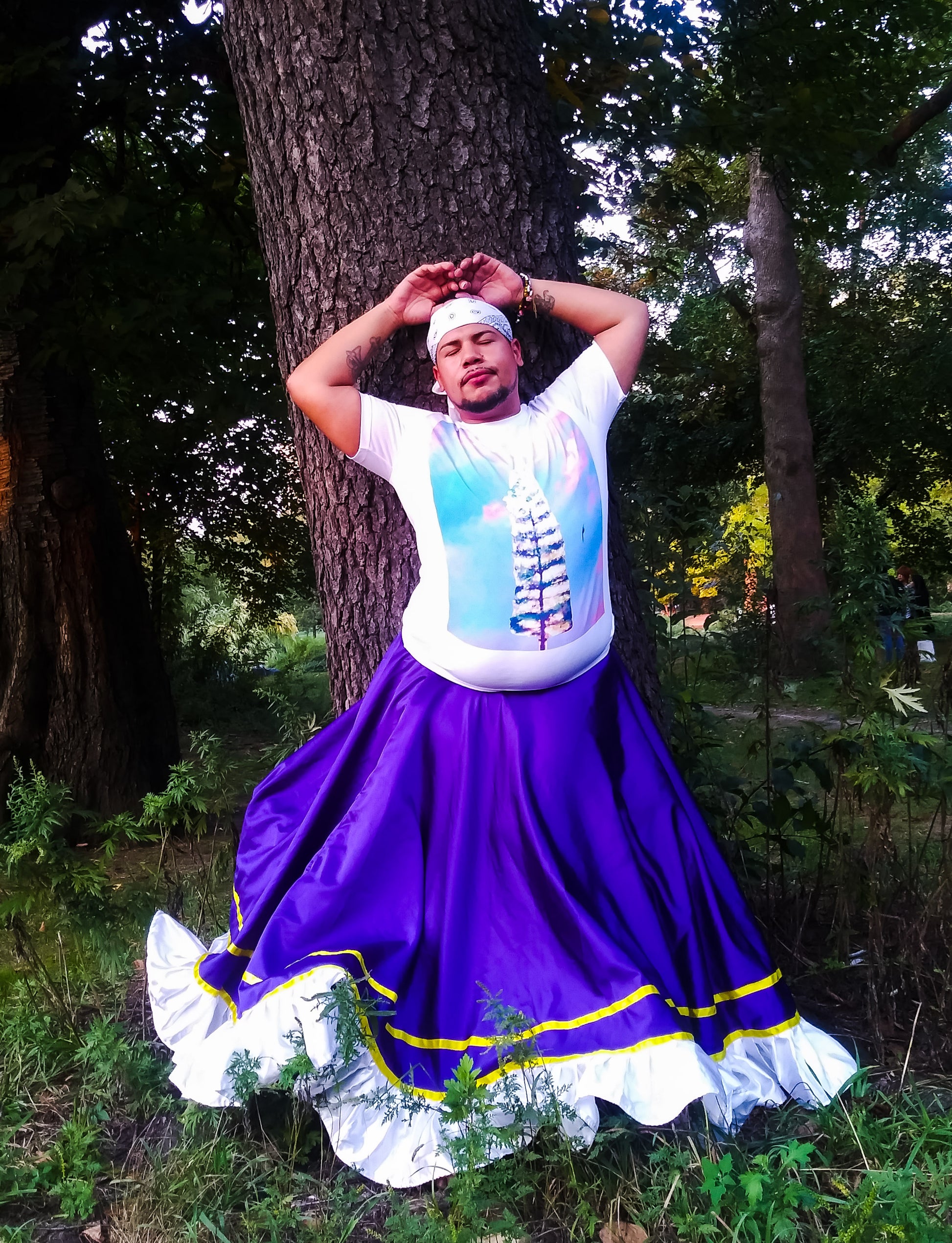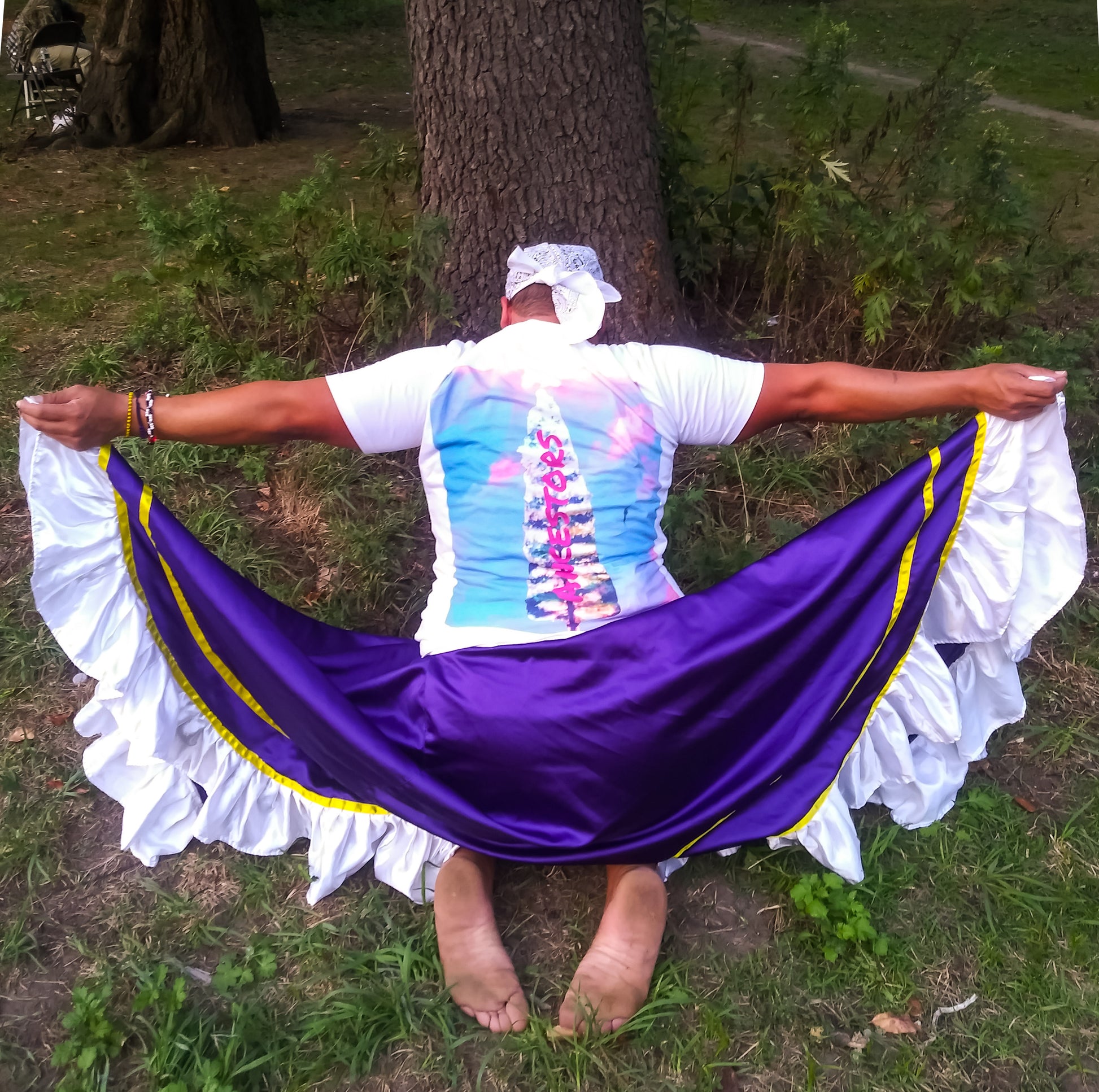 Your ancestors are here with you, at all times, guarding your spine with their potluck of DNA. they are so present with you, in fact, that the word "Ancestors" is printed along the spinal column at the back of this shirt, like the center of a tree, holding your movements into a grounded set of wise and unseen roots.