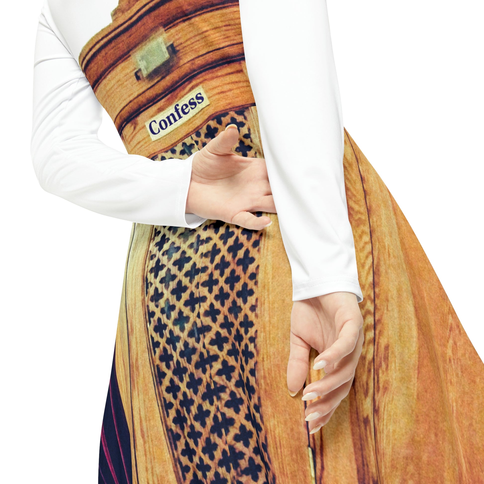 You are a walking confessional. This long sleeved dress is printed in a full circumferential barrel style with a real image of a church confessional. For those of us who have wrapped our bodies with the sweeping shame of societal taboos, you are now able to dress your body in the recognition of it to be freed of it.