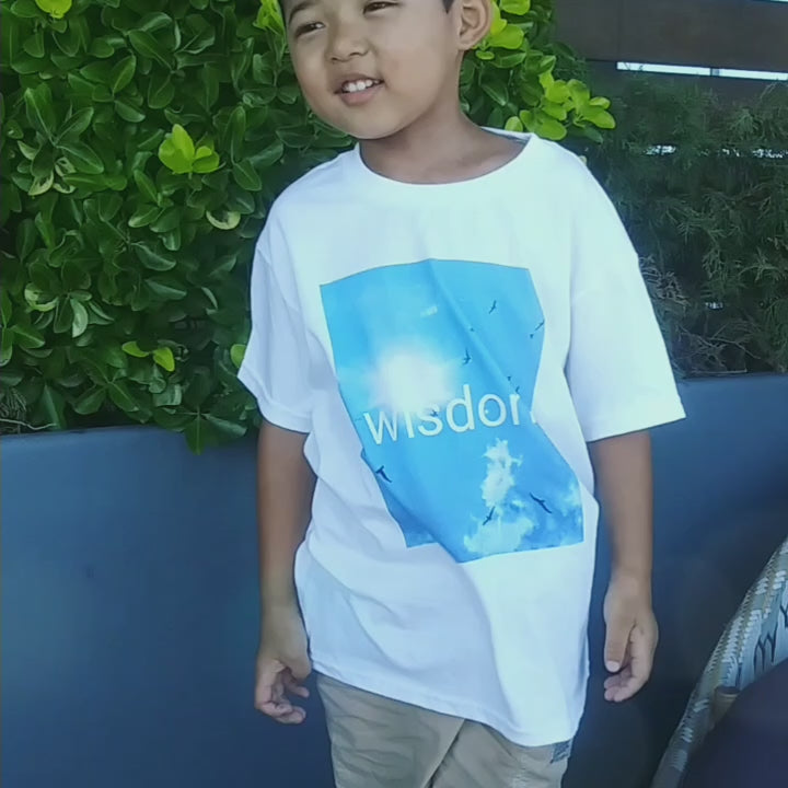 This child was born with a wisdom that we should never allow ourselves to forget! Let them wear this T shirt every now and again to remind you, as the word "wisdom" across their torso blends in with the limitless creativity of the sun. There is ingenuity in playing in the mud and spending hours acting from the unadulterated imagination that we could learn from once again.