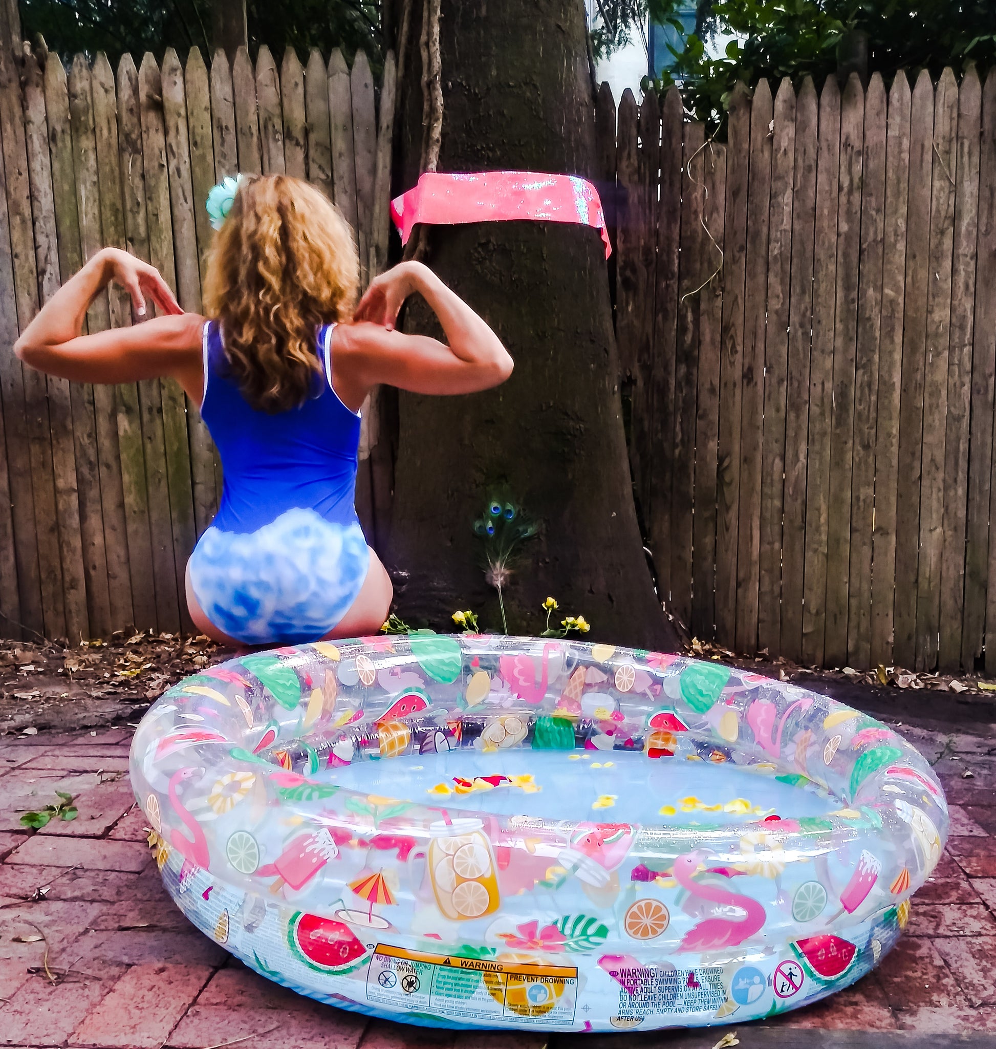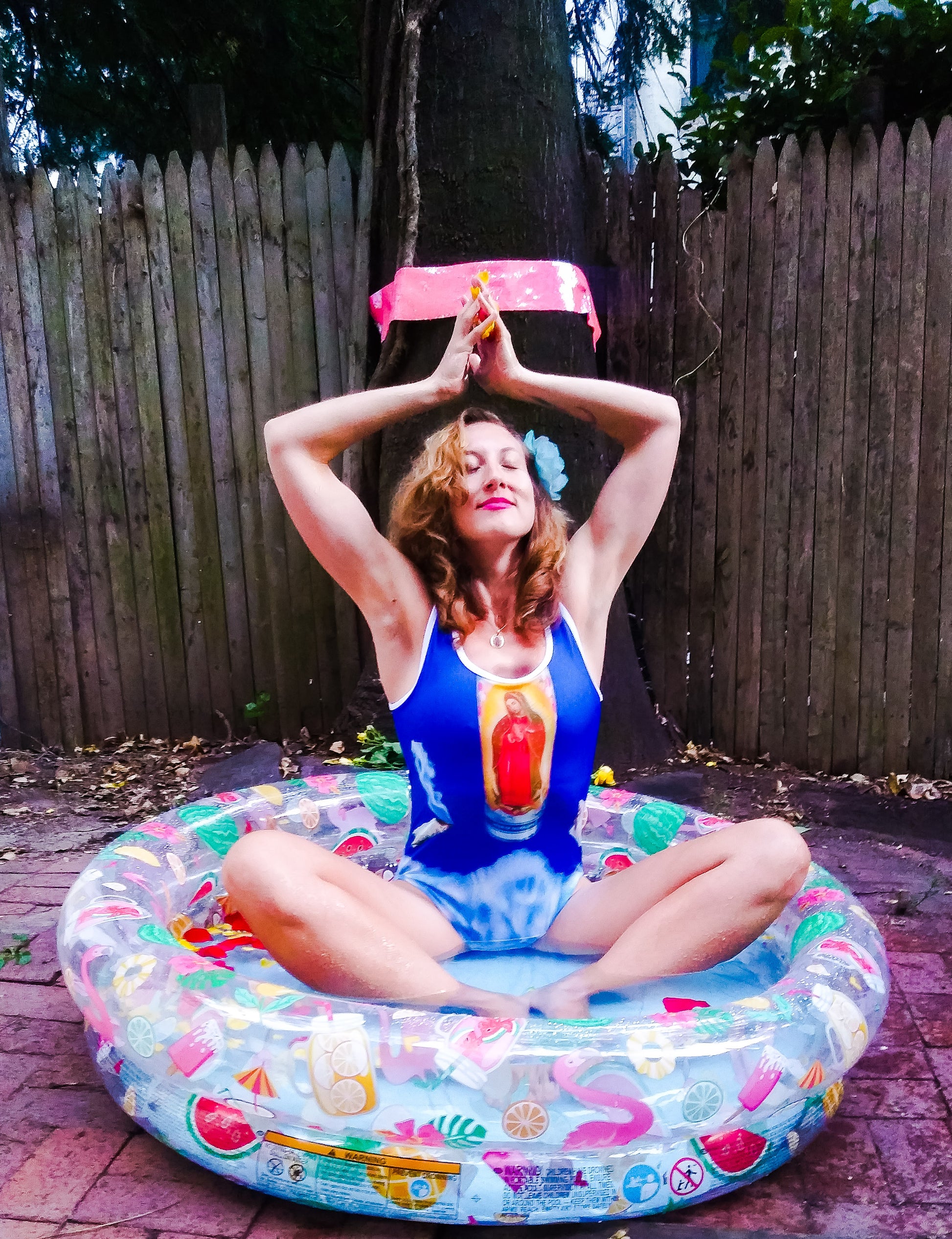You came here to this ocean for a ritual. Guadalupe is at the center of your chest, her candle illuminated, guiding you as you swim to her to commune and mingle the sacred waters within you with the salt hug of her own waters around you. A bundle of sage is smoking on your right hip, and the printed face of a real life seashell is on your left. This swimsuit is a tool belt of ceremony for you to speak to the ocean, using the voice of your higher self.